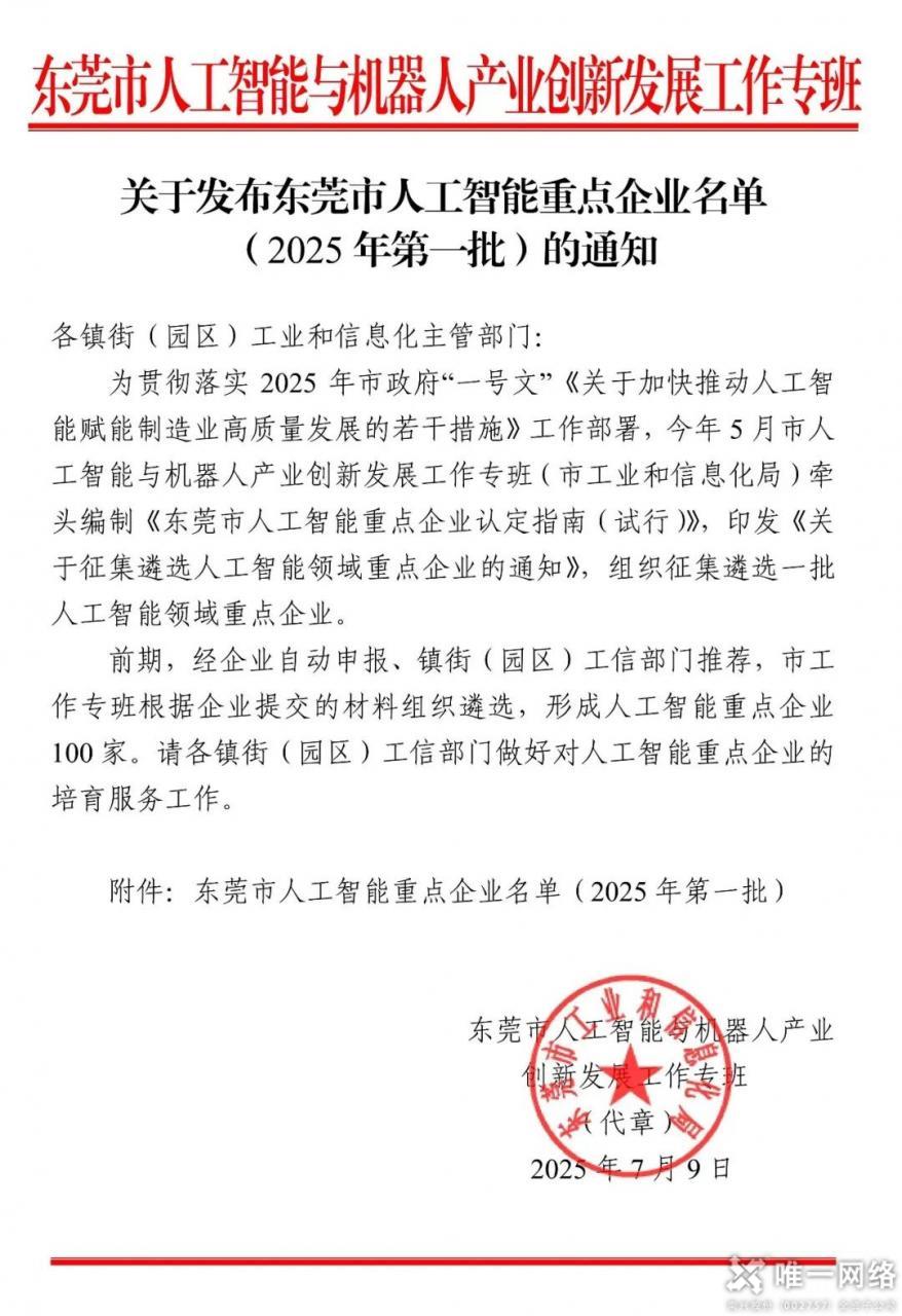 近日,東莞市人工智能與機器人產業創(chuàng)新發(fā)展工作專班正式發(fā)布《東莞市人工智能重點企業名單(2025 年第一批)》,唯一網絡憑借在人工智能領域的戰(zhàn)略布局、技術積淀與產